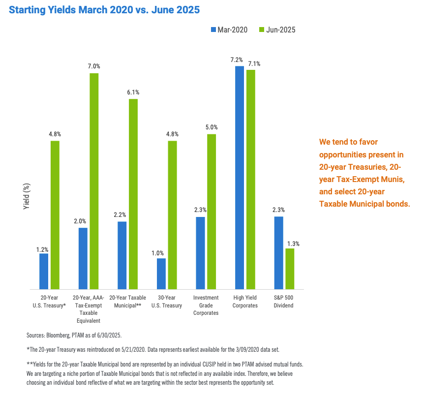 One of the founding principles of our math-based, macro-agnostic approach, Shape Management, is that yield is not a good proxy for total return. In other words, yield is not what you get. However, while yield is an incomplete measure of total return, starting yields have historically been correlated with go-forward returns. Put differently, yield and total return are not the same, but starting yields can still hint at the direction of future return potential. Here’s what I mean. In August 2020, the Bloomberg US Aggregate hit its all-time low yield. 1 What followed was (and is) the longest bear market in bond history, at 58 months and counting. What preceded this unprecedented drawdown? Unprecedented low yields. Even though yields had reached all-time lows, investors added more than $445 billion to bond funds in 2020.2 Today, the picture for fixed income looks completely different, which should be understood as a very good thing for investors. While yields are not at unprecedented levels, yields across some of our favorite asset classes – long U.S. Treasuries, Tax-Exempt Municipal bonds, and Taxable Municipal bonds – are at levels rarely seen over the past few decades. We believe this presents a go-forward opportunity rarely available over the same period.
