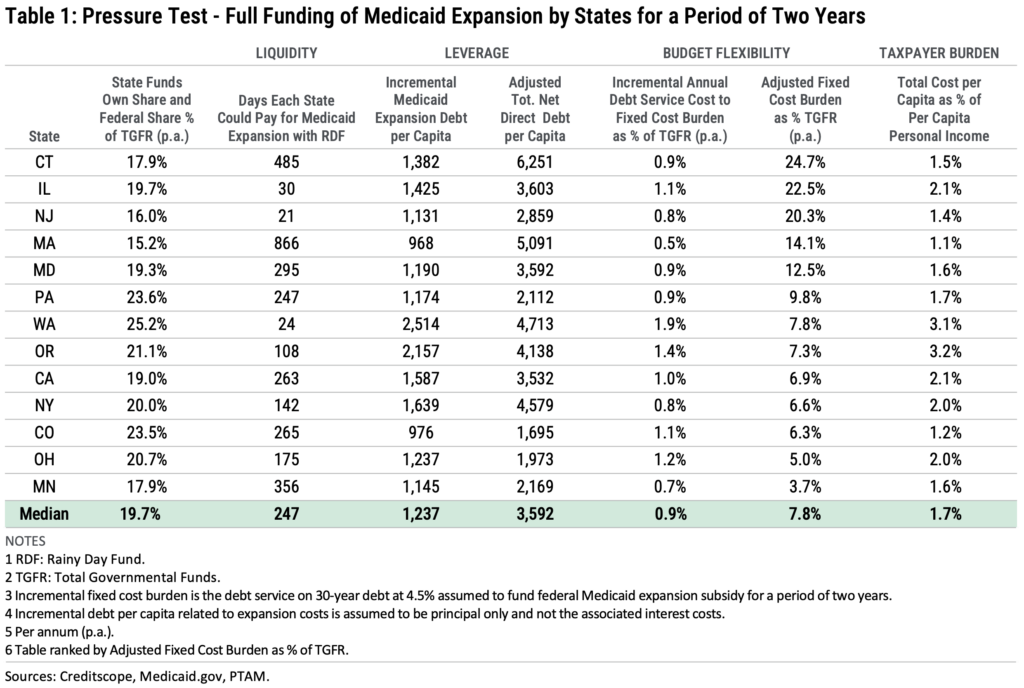 To illustrate the impact of potential federal cuts to Medicaid, we examined the top 15 states in debt outstanding (which account for approximately 79.0% of total state debt outstanding) and assumed that both states with and without trigger laws would temporarily fully fund their respective federal shares of Medicaid Expansion costs for two years as a stopgap measure, while state legislatures work towards longer-term, sustainable solutions. Medicaid expansion is expensive relative to state budgets, even with the existing 90.0% federal match rate in place. Simply funding the full cost of the federal share on a multi-year go-forward basis may cause fiscal strain. There could be instances where certain states, with both the financial flexibility and legislative support, fund the expansion for a longer period.